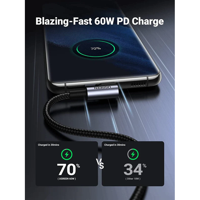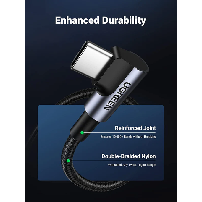 Kabel Ugreen USB-C, kutni, 60W, 2m, pleteni, crni, 50125