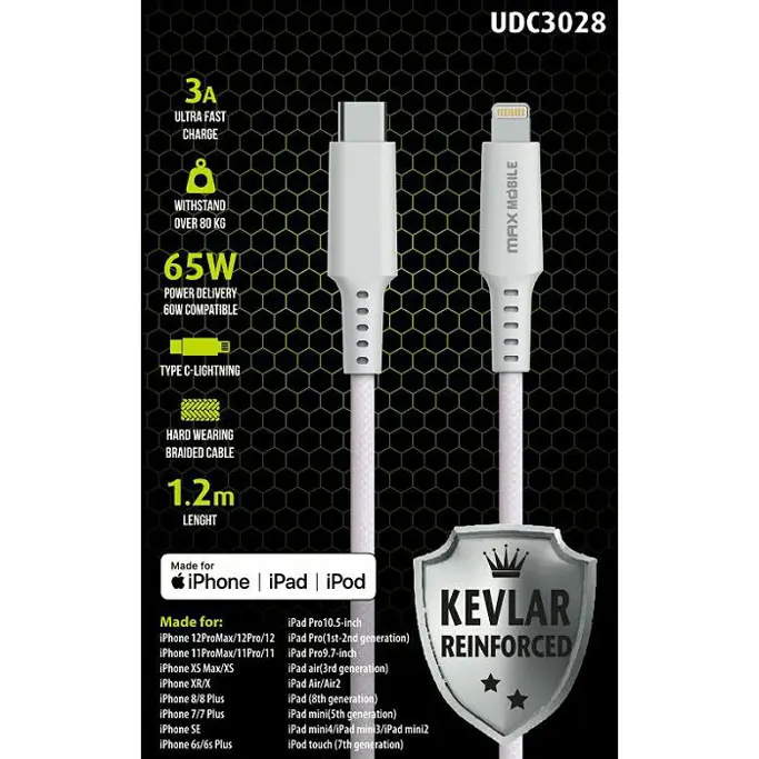 Kabel USB 2.0, 1.2m USB-C/Lightning M/M, Maxmobile UDC3028 Kevlar MFI, 3A/65W, Bijeli